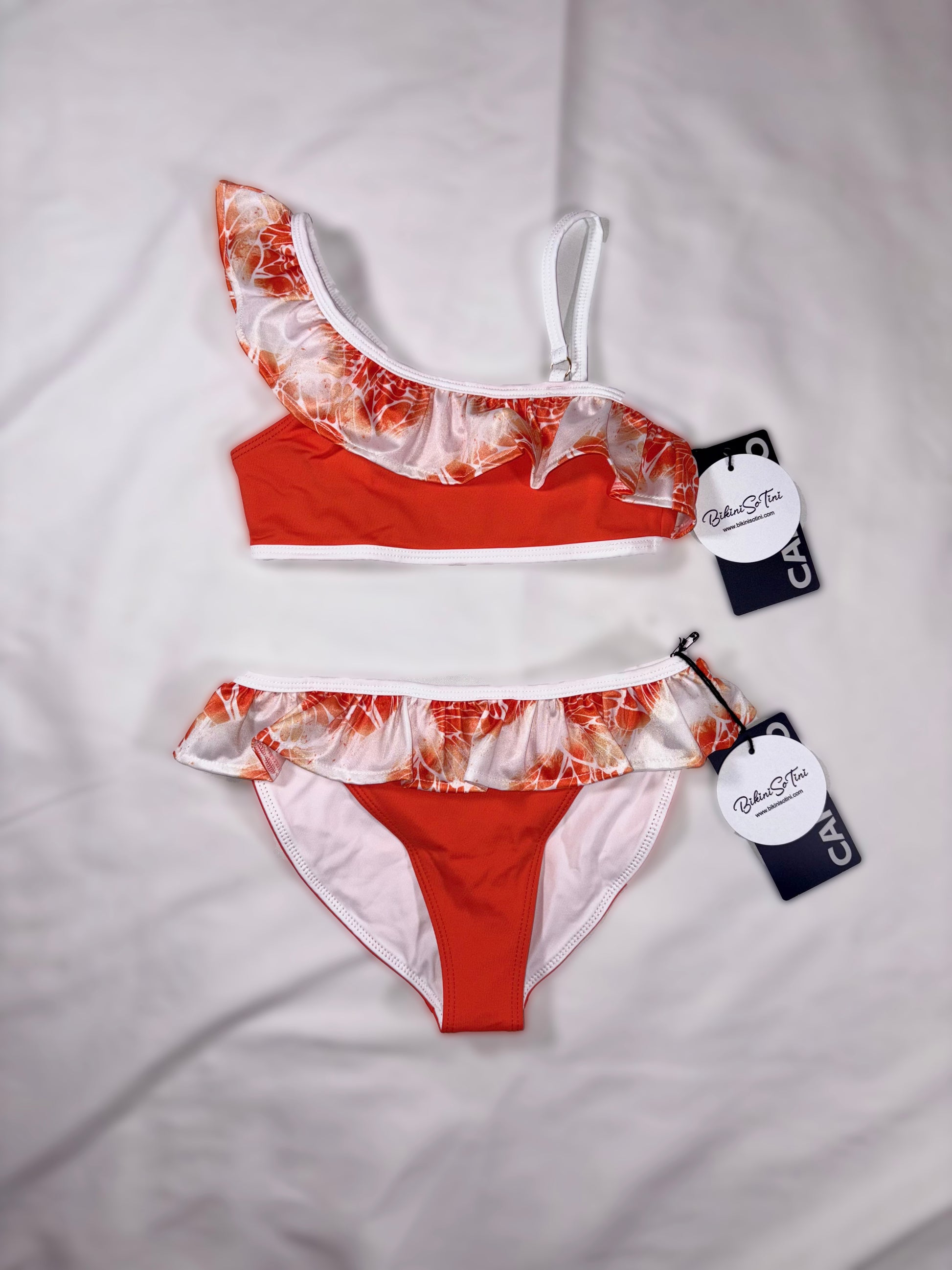 The Bella Bikini Set is a fun and eco-friendly choice for little girls who love to shine! Featuring a playful one-shoulder ruffle and sparkling gold details, this bikini brings a touch of magic to every splash. Made with sustainable materials, it’s perfect for sunny days filled with laughter and adventure.